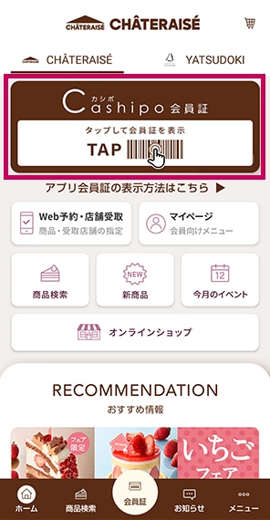 シャトレーゼ公式アプリの「Cashipo」をタップします。