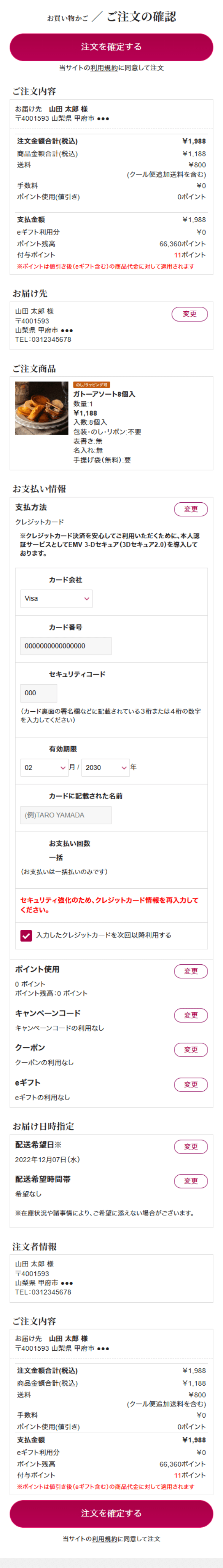 ご入力内容をご確認ください。クレジットカード以外を選択された方は「注文を確定する」をクリックし、ご注文完了となります。