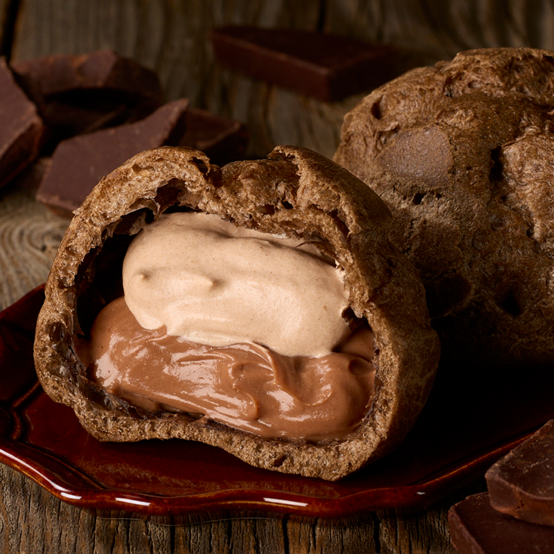 ぴーたろう柔らかなココアシュー生地になめらかチョコカスタードクリームとふんわりチョコホイップクリームが包まれていて、1つで2種類のチョコシュークリームを食べたような満足感です。しっかりとしたチョコの風味が感じられます。