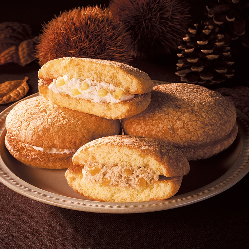 イタリア栗のマロンブッセ:バタークリームに栗甘露煮ダイスが入っている為、栗の食感と風味を感じられるふんわり食感のブッセです。 きめ細かいメレンゲを合わせたアーモンド生地を、高温短時間で外はさっくり、中はふんわりと焼き上げました。 イタリア栗を使用した口どけの良い栗のバタークリームをサンドしました。