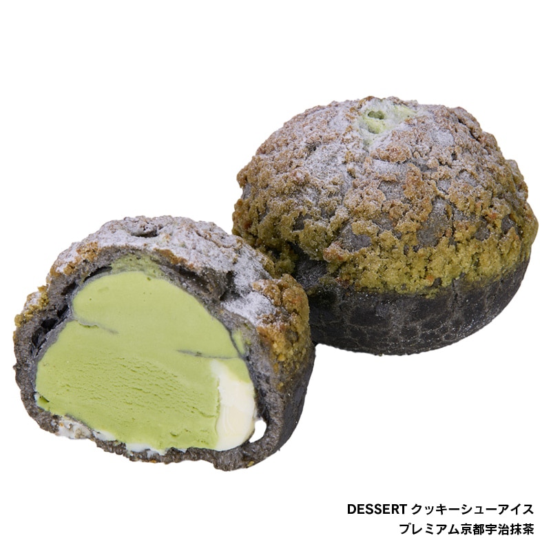 堅焼きクランチを混ぜ込んだ京都府産宇治抹茶入りクッキーをのせ、こんがりと香ばしく焼きあげた竹炭入りの黒いシューパフの中に、濃厚で滑らかな口溶けの京都府産宇治抹茶アイスクリームと、それを包むようにパキっと食感のホワイトチョコを詰めました。 香ばしい宇治抹茶クッキーシューと、食感の楽しいホワイトチョコが、宇治抹茶アイスのおいしさをさらに引き立てるプレミアムなシューアイスに仕上げました。