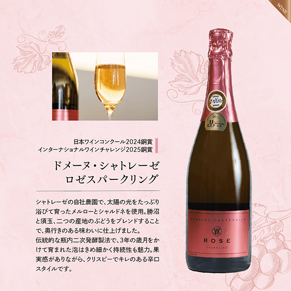その実力は国内外でも高く評価され、日本ワインコンクール2024、インターナショナルワインチャレンジ2025でともに銅賞を受賞。本格的な味わいを楽しめる、上質なロゼスパークリングです。