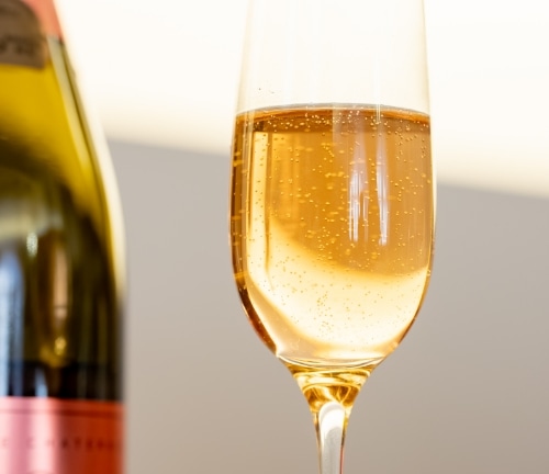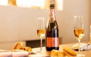 グラスに注いだ瞬間あふれだす繊細な泡と美しいロゼ色が印象的です。