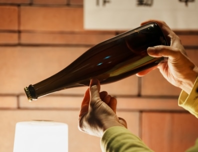 熟成後は、瓶内で役目を終えた酵母を集める工程へ。瓶を逆さにし、毎日少しずつ回転させながら角度を変え、澱を瓶口へと集めていきます。約1カ月にわたり手作業で行われるこの工程も熟練の技が欠かせません。