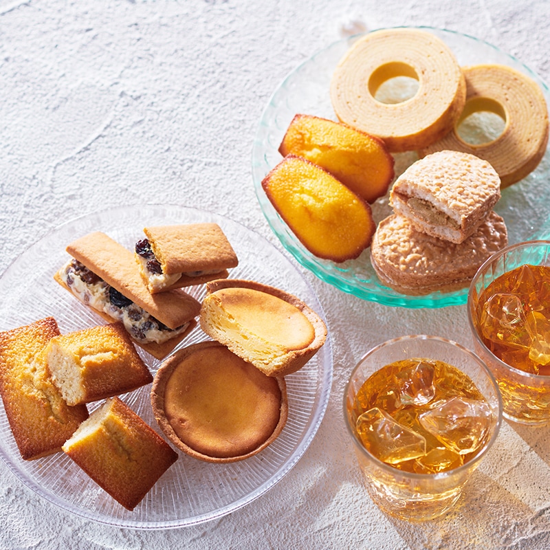 クリームチーズを使用した「ベイクドチーズタルト」、風味豊かな「バウムクーヘン」、バターのうまみがじっくりと味わえる「マドレーヌ」、 しっとりとした食感の「フィナンシェ」、サックリとした食感の「ダックワーズコーヒー」、 芳醇な香り広がる自家製レーズンをクリームにたっぷりと混ぜ込みクッキーにサンドした「シャトー・レザン」が入った焼き菓子の詰合せです。