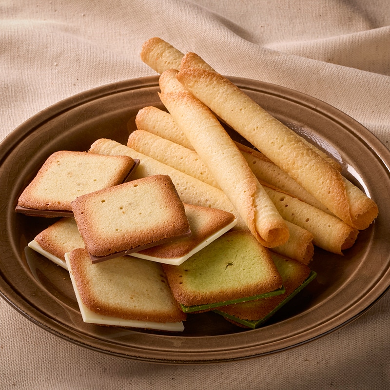バター生地とチョコレートの風味が広がる、みんなに愛されるチョコレート菓子ラングドショコラサンドは3種類(ホワイト・ミルク・抹茶)のチョコをサンドしました。 ラングドシャロールは、ラングドシャのサクサク食感と、上品な甘さのチョコレートが口の中いっぱいに広がる商品です。コク深く芳醇なバターが口いっぱいに広がり、サクッとホロっとほどけるような、やさしい食感をお楽しみください。