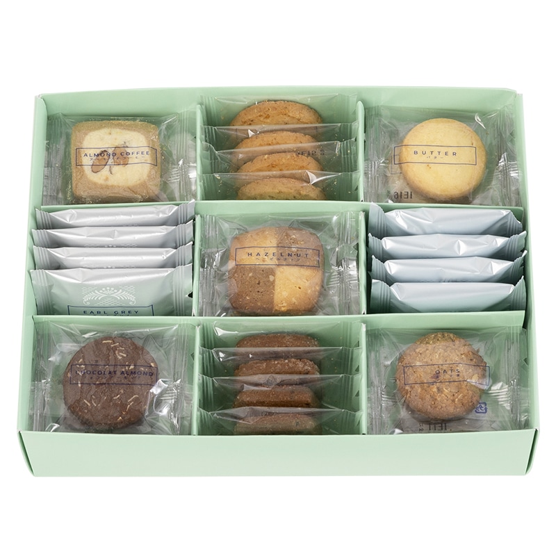 バターやうみたて卵、アーモンドの加工方法へのこだわり、ナッツ類や特徴的な素材を使用した、9種の様々な食感と風味のクッキーに仕上げました。見た目も楽しい、バラエティ豊かな9種の味を、食べやすい大きさに仕上げ、個包装にし詰合せました。ショコラアーモンドクッキーを加え、デザインも一新し、発売いたします。 バターの濃厚なおいしさと、素材の引き出す香りや風味・食感がそれぞれに特徴のあるクッキーです。