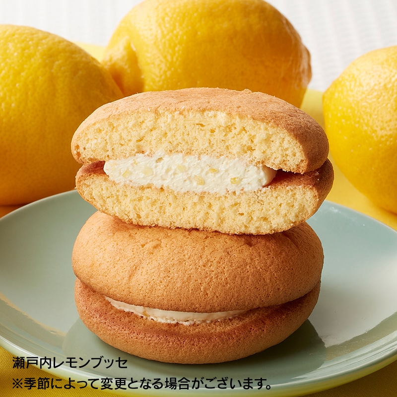 [瀬戸内レモンブッセ]ふっくら柔らかく焼き上げたブッセ生地で、口溶けのよい滑らかなクリームにホワイトチョコをブレンドし、香りのよい瀬戸内レモン皮砂糖漬けのダイスを加えた、レモン風味クリームをサンドしました。 レモンの酸味と甘さが絶妙なバランスでフレッシュでさっぱりとした味わい広がる季節ブッセです。
